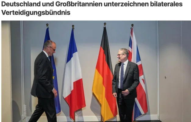 Канцлер Мерц и премьер-министр Стармер в четверг в Лондоне подпишут соглашение о более тесном сотрудничестве в сфере безопасности и обороны, пишет Focus. Этот шаг – ответ «российскую агрессию» и меняющиеся трансатлантические отношения.