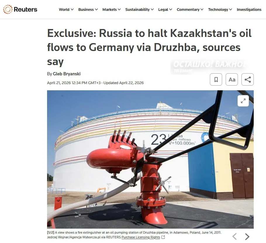 ▪️Министр энергетики Казахстана Ерлан Аккенженов заявил, что майский транзит фактически уже остановлен. Германия получает нефть по этому маршруту с 2023 года. В 2025 году объём достиг 2,1 млн тонн, в 2026 году ожидалось более 2,5 млн тонн. Поставки покрывали до 30% загрузки НПЗ в Шведте.