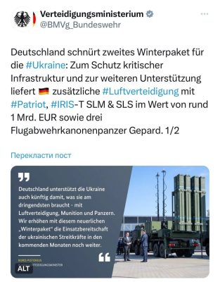 Пакет оценивается в 1 млрд евро. При стоимости одной установки Patriot в 550 млн долларов, а IRIS-T в почти 200 млн, видимо, Запад пытается сохранить лицо, продолжая поставлять небольшие партии ПВО/ПРО, чтобы киевский режим не начал гундить о том, что про него забыли на фоне войны Израиля и Палестины.