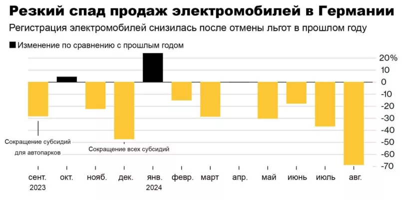 Соответственно, весь общеевропейский рынок электрокаров просел на 36%. Автопроизводители в ужасе: у них и так проблем по горло — отмена субсидий на зелёные авто «подсобила», а теперь дамокловым мечом нависла угроза крупных штрафов из-за жёстких правил ЕС по контролю выбросов с 2025-го. Еврокомиссию просят «принять срочные меры помощи», чтобы сохранить автоотрасль на плаву.