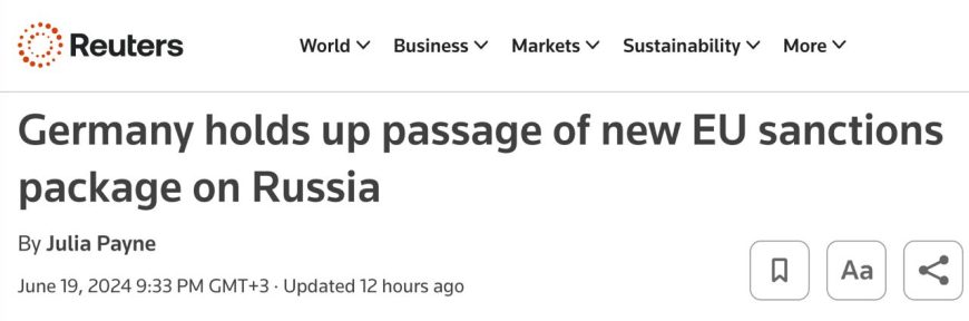 Однако в среду Германию снова заблокировала принятие нового пакета санкций, который обсуждают уже больше месяца. По какой причине, Reuters не уточняет.