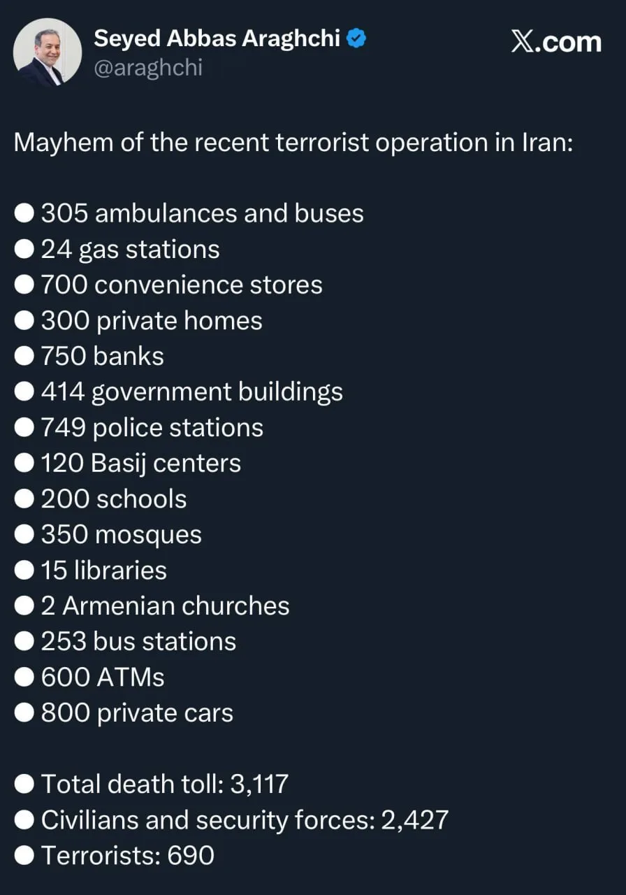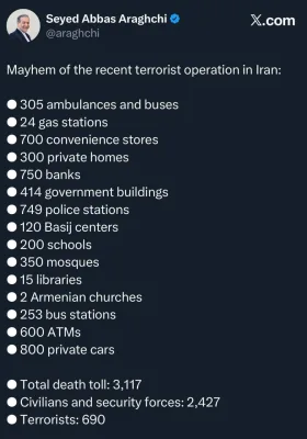 По словам Арагчи, из них 2 427 погибших были правоохранителями и гражданскими, еще 690 являются «террористами» (видимо, те кто принимал участие в протестах).