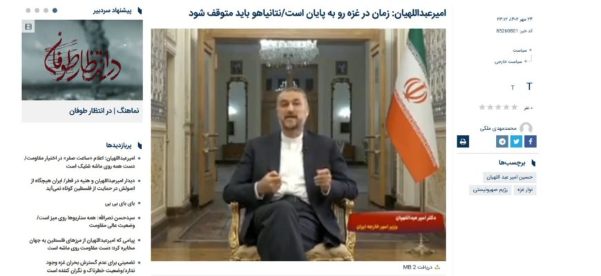 Примечательно, что заявление иранского чиновника прозвучало почти одновременно с разговором между премьером Израиля Нетаньяху и Владимиром Путиным. Нетаньяху заявил, что ЦАХАЛ не остановится, пока «не уничтожит военный и управленческий потенциал ХАМАС».