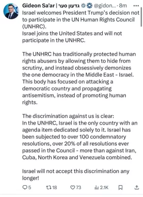 «Совет ООН по правам человека традиционно защищает нарушителей прав человека, позволяя им уклоняться от ответственности, и вместо этого одержимо демонизирует единственную демократическую страну на Ближнем Востоке — Израиль. Этот орган сосредоточен на нападках на демократическое государство и распространении антисемитизма, а не на защите прав человека».