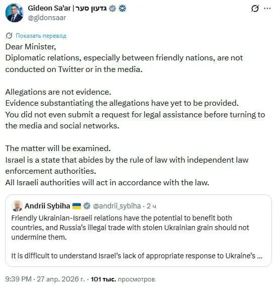 По его словам, Украина не предоставила доказательств того, что зерно, пришедшее в Израиль, прибыло с новых российских территорий.