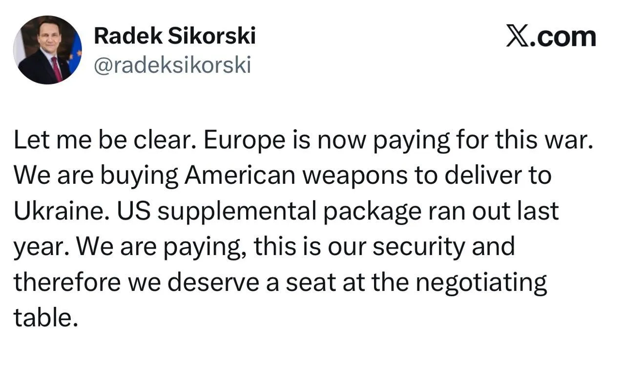 По его словам, Европа фактически оплачивает продолжение войны: закупает американское оружие для передачи Украине и компенсирует сокращение прямой военной помощи США.