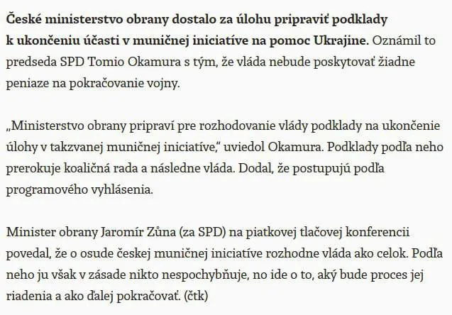 «Бюджетные средства больше не будут использоваться для покупок боеприпасов и оружия для Украины», — сообщил спикер парламента Чехии.
