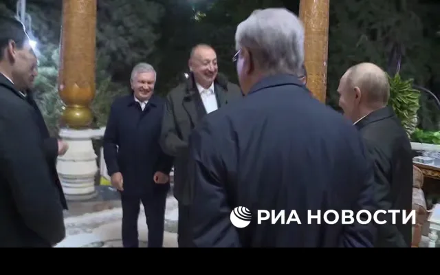 На кадрах Путин и Алиев обнимаются на неформальной встрече лидеров стран СНГ после переговоров в Душанбе.