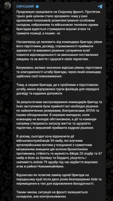 Как отметил главком, в течение трех дней работы на восточном фронте он понял, почему при одинаковых показателях укомплектования одни бригады сдерживают атаки противника и держат позиции, а другим это не удается.