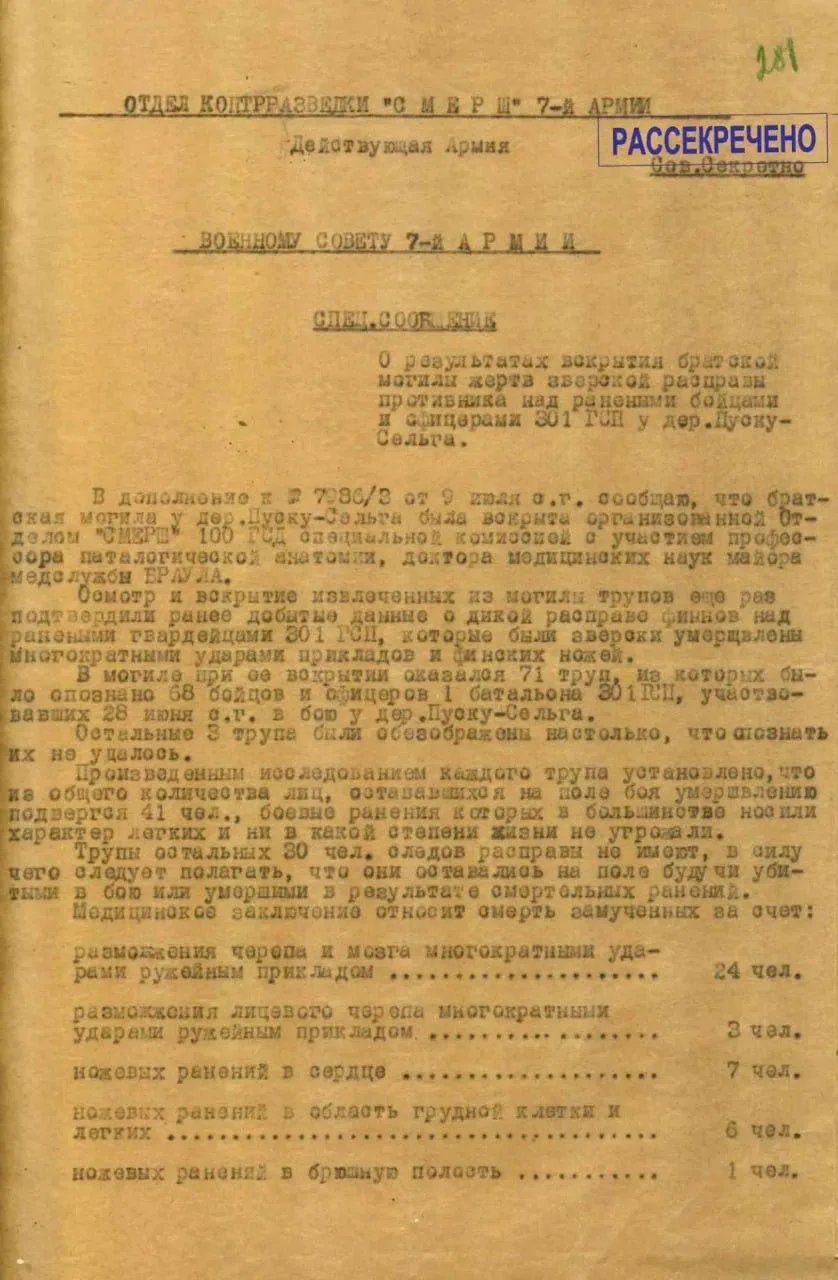 В районе деревень Пуску-Сельга и Кото-Ярви нашли братскую могилу – 71 тело. Большинство невозможно опознать: следы пыток и изуродованные лица.