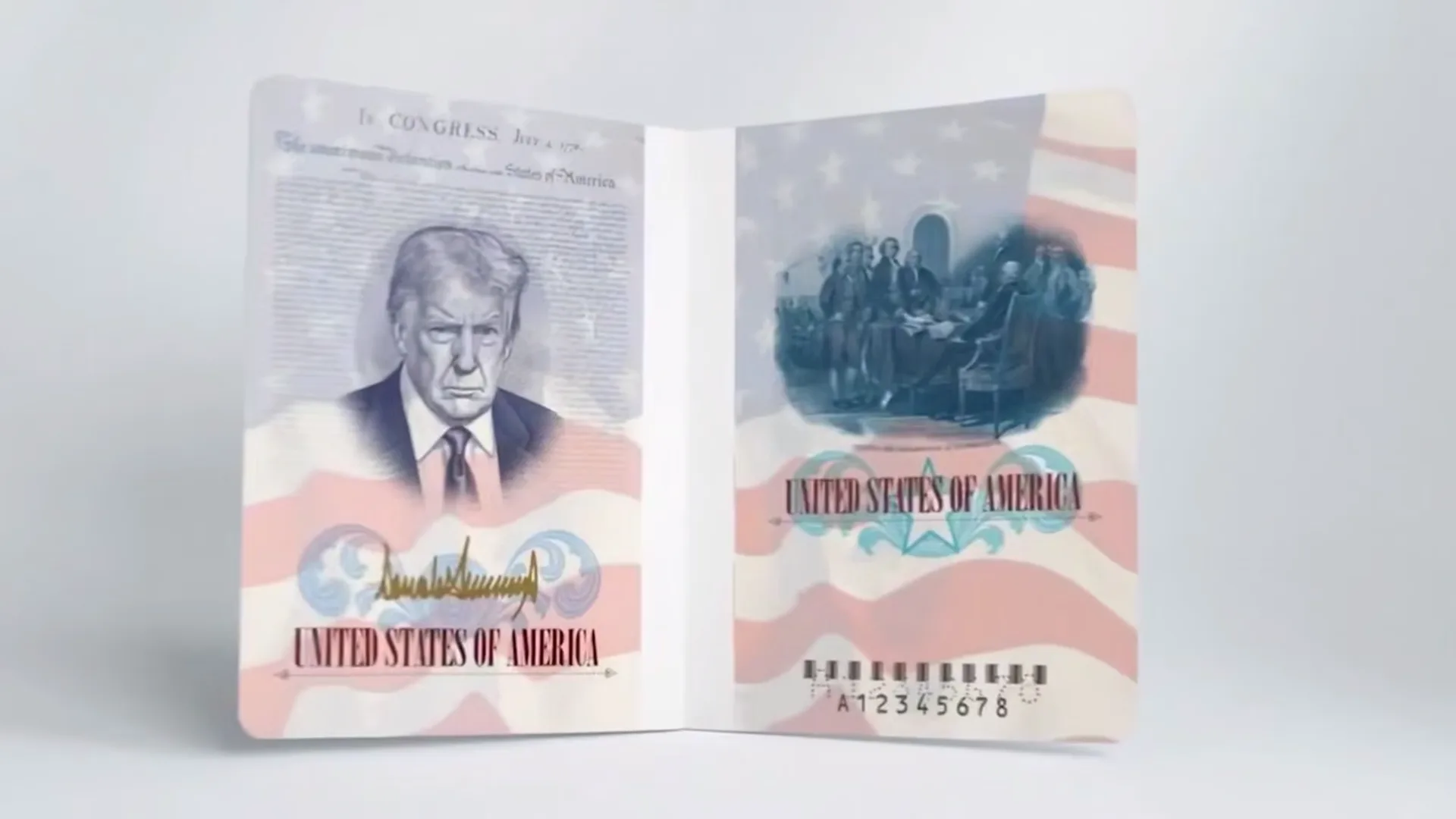На макете паспорта портрет Трампа на внутренней стороне документа окружен текстом Декларации независимости и американским флагом. На другой странице размещена картина американского художника Джона Трамбулла «Декларация независимости», изображающая отцов-основателей Америки.