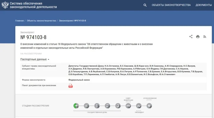 - Проект вносит поправки в закон «Об ответственном обращении с животными» и направлен на «защиту жизни и здоровья граждан, особенно женщин и детей», от угроз со стороны бродячих собак.
