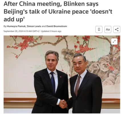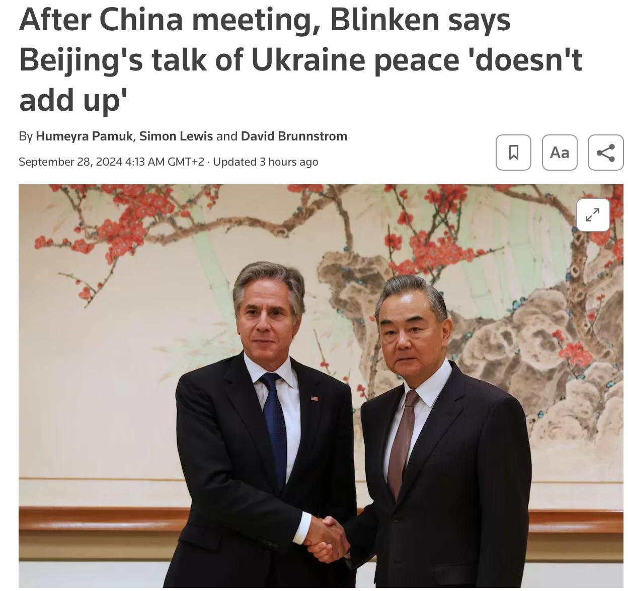 На встрече с министром иностранных дел КНР Ван И он заявил, что разговоры Пекина о мире на Украине «не сходятся» с тем, что Китай поддерживает военно-промышленный комплекс России.