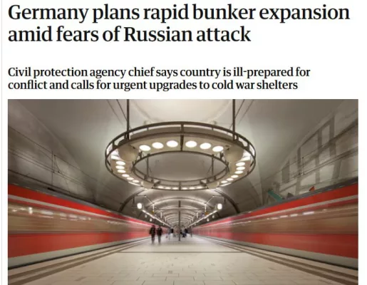 - Германия всерьёз наращивает меры гражданской защиты на фоне роста международной напряжённости. Как сообщает The Guardian, Федеральное управление по защите населения и ликвидации последствий катастроф готовит масштабное расширение сети бомбоубежищ и укрытий. Под защитные сооружения собираются переоборудовать тоннели метро, подземные парковки и подвалы. Планируется, что укрытия смогут вместить до миллиона человек.