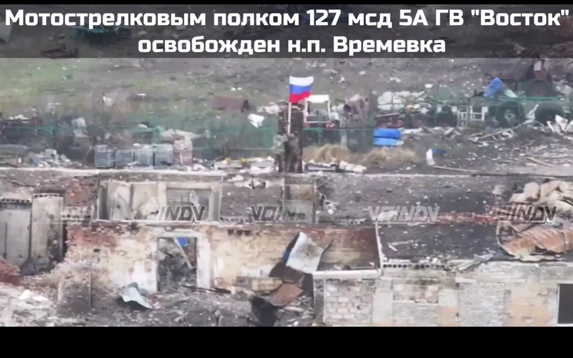 - Штурмовыми подразделениями мотострелкового полка 127 мсд 5 армии группировки «Восток» освобожден н.п. Времевка!!! Нашими Воинами установлен российский флаг на здании по улице Партизанская перед мостом через р. Мокрые Ялы. Дальневосточники закрепляются на позициях.