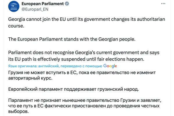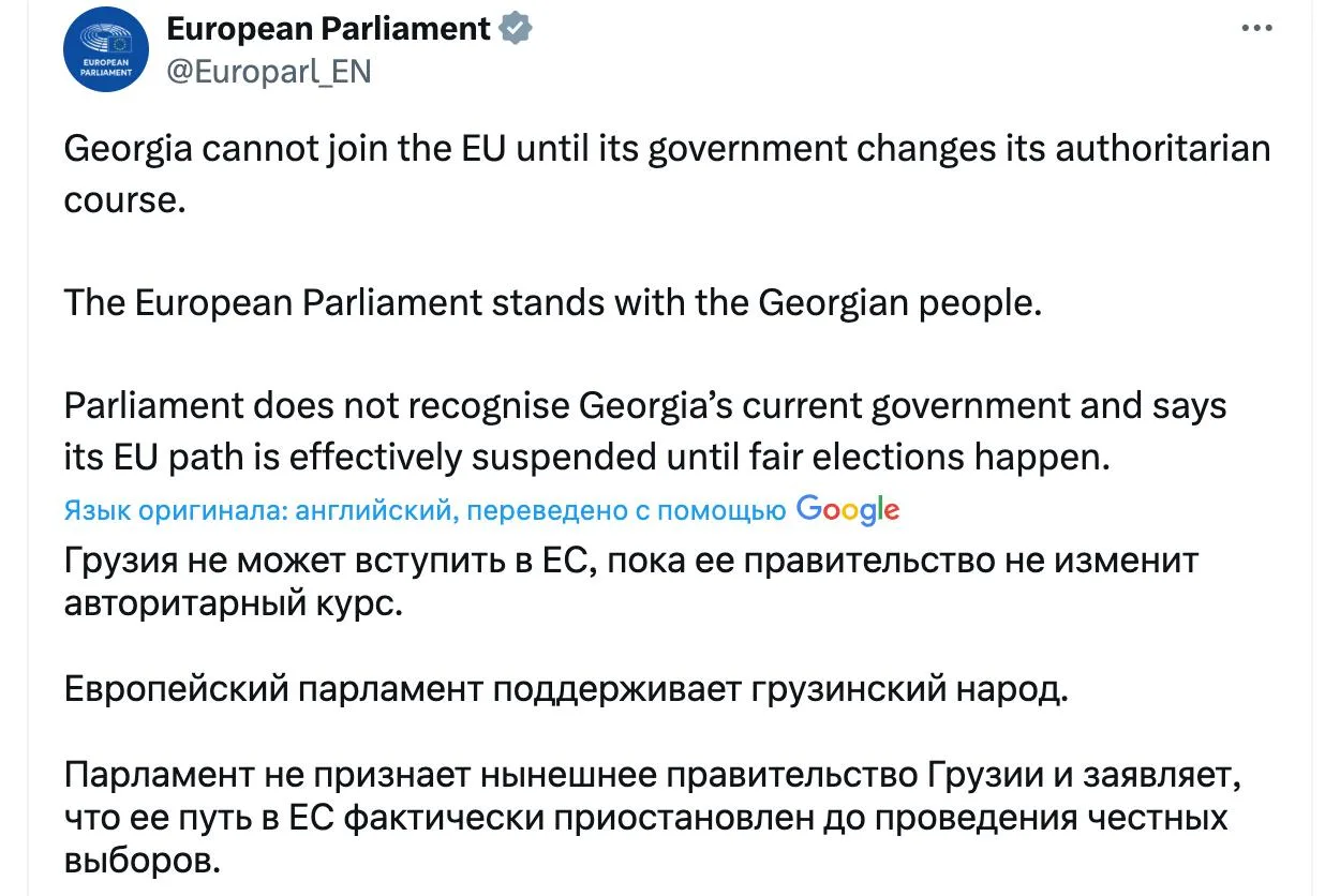 «Европейский парламент поддерживает грузинский народ», — говорится в официальном заявлении в соцсети X. Действующее правительство в Брюсселе не считают легитимным партнёром, а саму внутреннюю политику Тбилиси называют авторитарной.