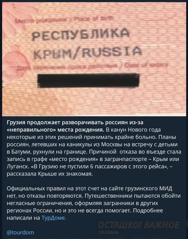 «В последнее время участились случаи отказа во въезде в Грузию гражданам Российской Федерации, в паспортах которых местом рождения указаны, в частности, Украинская ССР, Абхазская АССР, Южная Осетия, Крым, Донецкая и Луганская Народные Республики, Запорожская и Херсонская области».