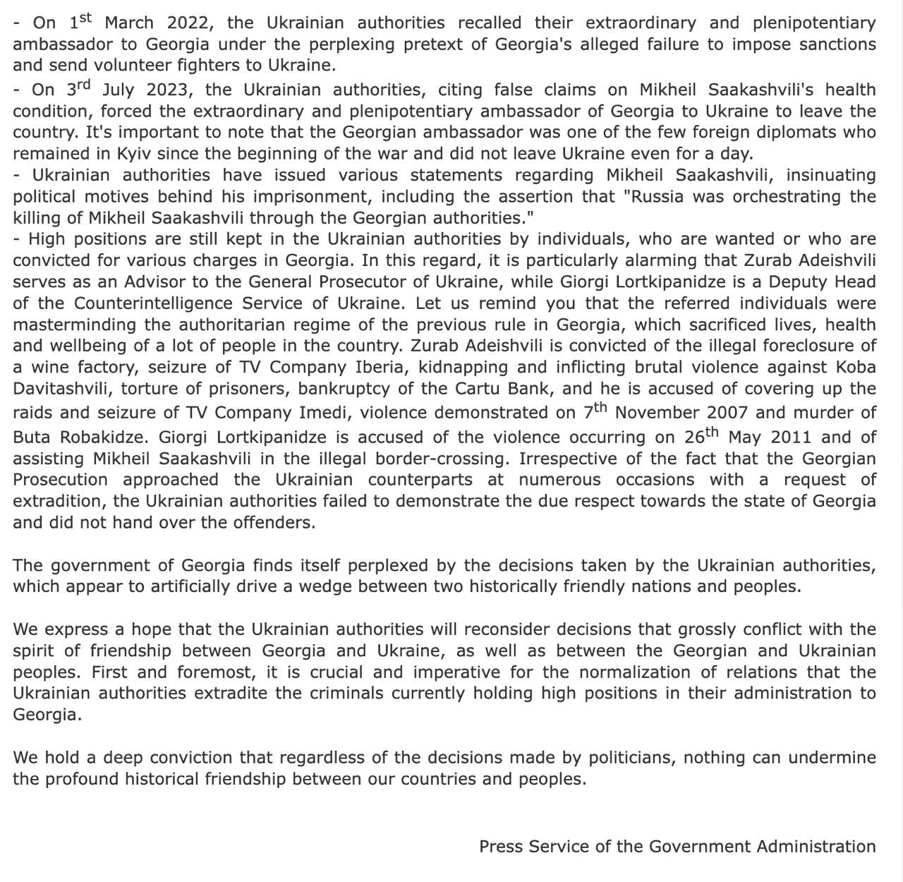 «Правительство Грузии недоумевает по поводу решений, принятых украинскими властями, которые, как представляется, искусственно вбивают клин между двумя исторически дружественными странами и народами.