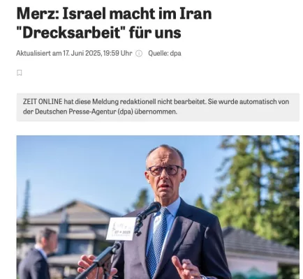 Канцлер Германии заявил, что Израиль «делает грязную работу» за весь Запад в конфликте с Ираном. По его словам, действия Тель-Авива заслуживают «только уважения», а иранский режим он назвал «террористическим», передает немецкое издание Die Zeit.