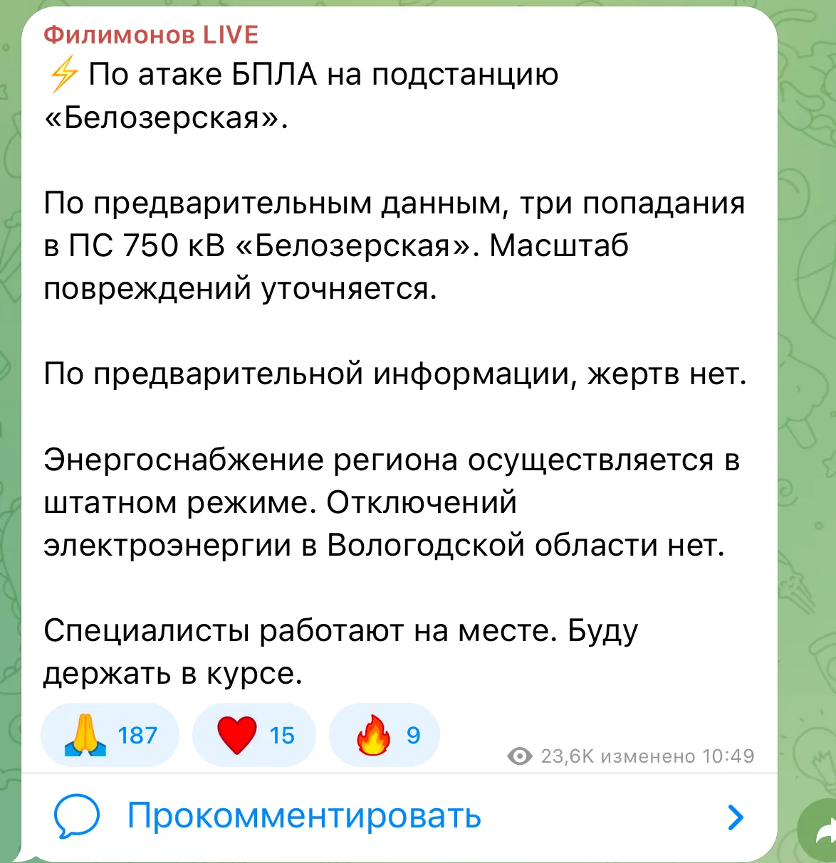 По предварительным данным, три попадания в ПС 750 кВ «Белозерская». Масштаб повреждений уточняется. По предварительной информации, жертв нет. Энергоснабжение региона осуществляется в штатном режиме. Отключений электроэнергии в Вологодской области нет. Специалисты работают не месте. Буду держать в курсе, — написал Филимонов.