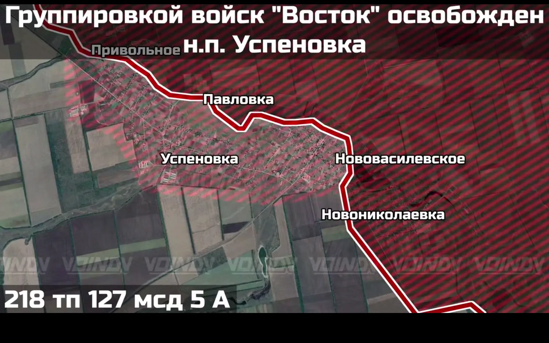 - Основным успехом дня стало освобождение населённого пункта Успеновка. Российские войска заняли село после серии штурмовых действий, вытеснив противника и разрушив его опорные пункты. Удержание Успеновки открывает возможности для продвижения в западном направлении и дальнейшего давления на оборонительную линию противника.