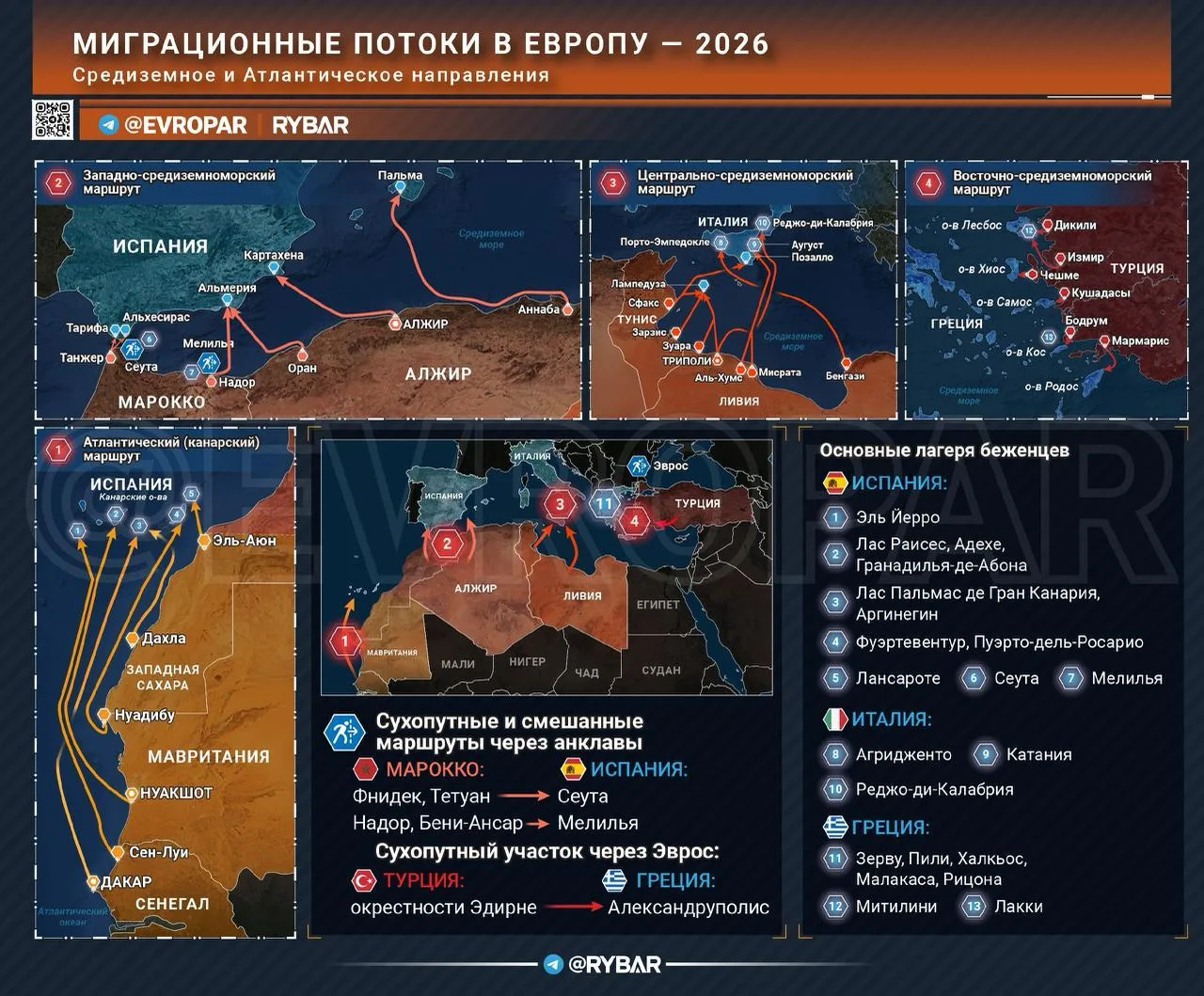 ▪️Беженцы едут по четырём основным маршрутам: из Туниса и Ливии морем добираются в Лампедузу и другие южные итальянские города, из Турции — на греческие острова, из Марокко и Алжира — в испанские Андалусию и Балеары, из Западной Африки — на Канары, а по суше — из Марокко в анклавные Сеуту и Мелилью и оттуда уже — в континентальную Испанию.