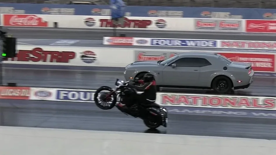 На драг-стрипе в Лас-Вегасе встретились Harley-Davidson Road King, Dodge Challenger SRT Hellcat Redeye и кастомный спортбайк. Схватка оказалась зрелищной и непредсказуемой. Один из участников удивил всех своим результатом. Кто оказался быстрее — узнаете в материале.