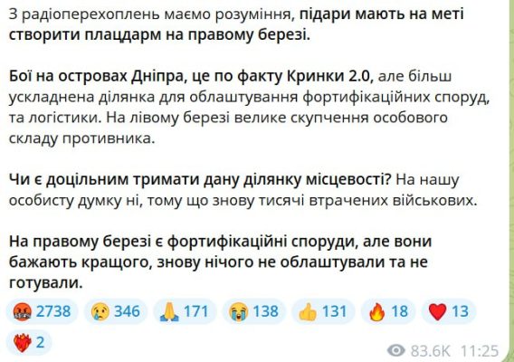 «Крынки повторяются на островах, и необходимо отвести войска на правобережье самостоятельно, иначе ВС РФ высадятся на него без особых усилий.»