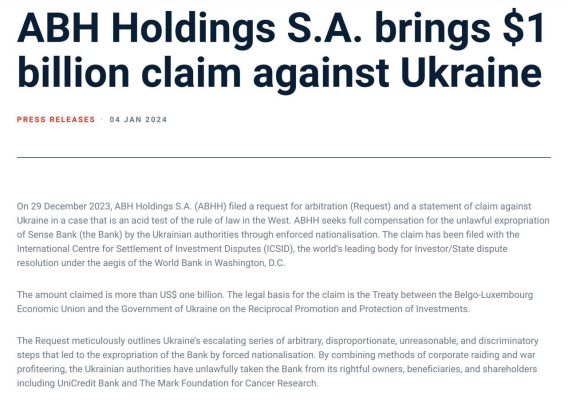 В запросе подробно описывается растущая серия произвольных, непропорциональных, необоснованных и дискриминационных шагов Украины, которые привели к экспроприации банка путем принудительной национализации.