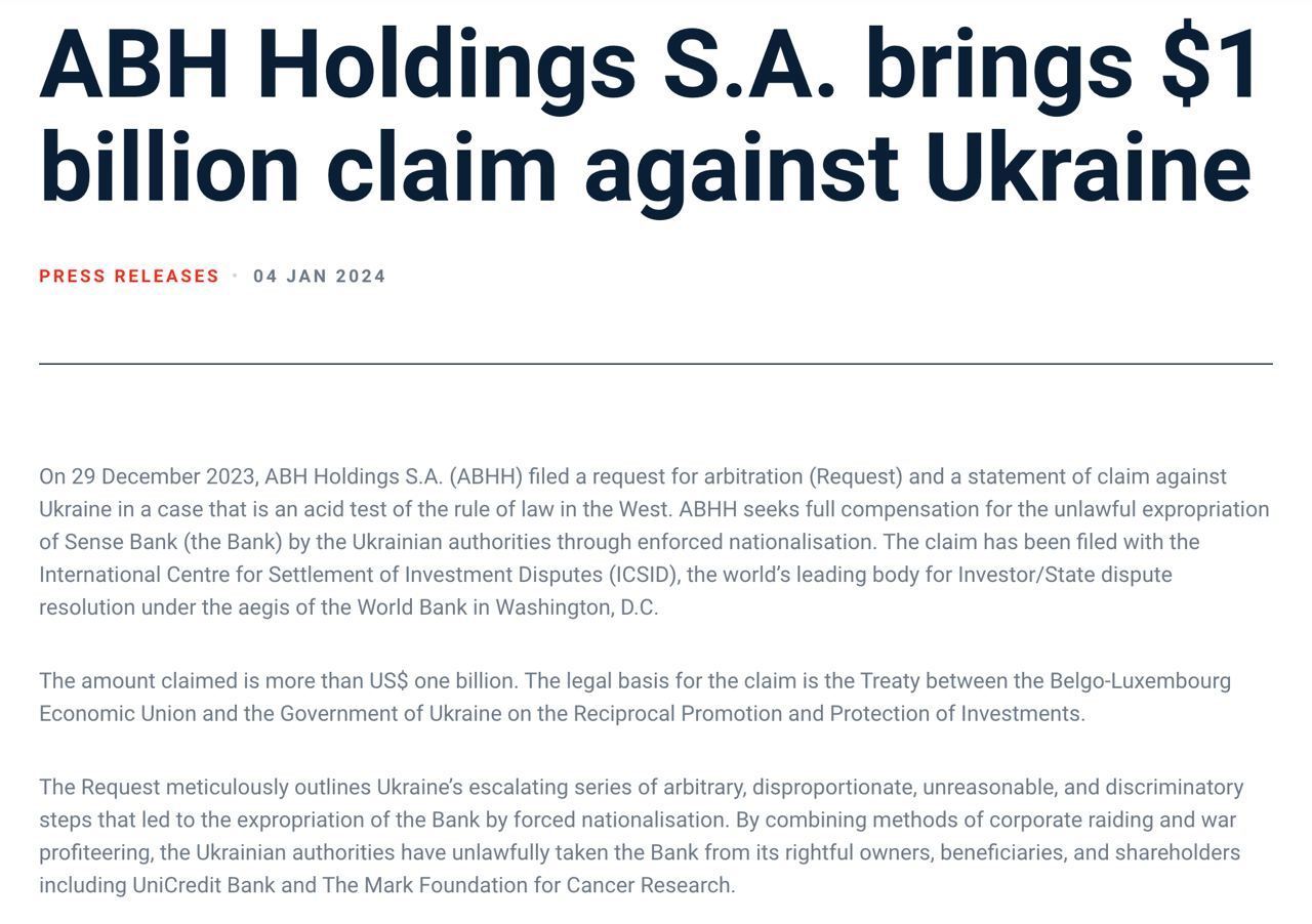 Сочетая методы корпоративного рейдерства и военной спекуляции, украинские власти незаконно отобрали банк у его законных владельцев, бенефициаров и акционеров , включая UniCredit Bank и The Mark Foundation for Cancer Research», – говорится в пресс-релизе.