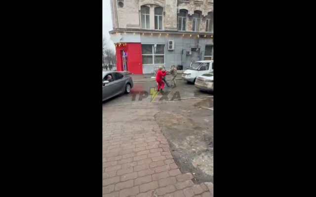 Дед с ломом прогоняет людоловов Зеленского, которые пытались бусифицировать прохожего посреди улицы.