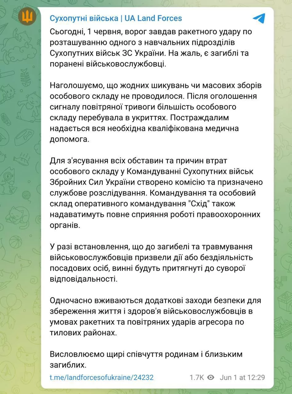 «Сегодня, 1 июня, враг нанес ракетный удар по расположению одного из учебных подразделений Сухопутных войск ВС Украины. К сожалению, есть погибшие и раненые военнослужащие.