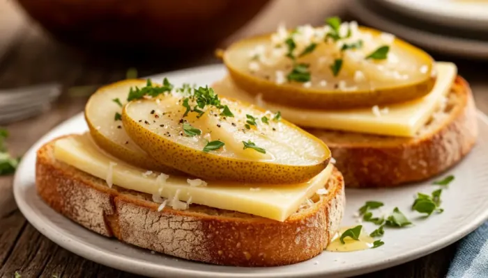 Тёплые груши в золотистой карамели, кремообразный сыр и хрустящий хлеб — сочетание, которое всегда оправдывает ожидания.