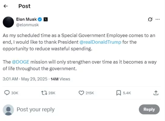 «Поскольку мое рабочее время в качестве специального государственного служащего подходит к концу, я хотел бы поблагодарить президента Дональда Трампа за возможность сократить расточительные расходы», — написал Маск в соцсетях.