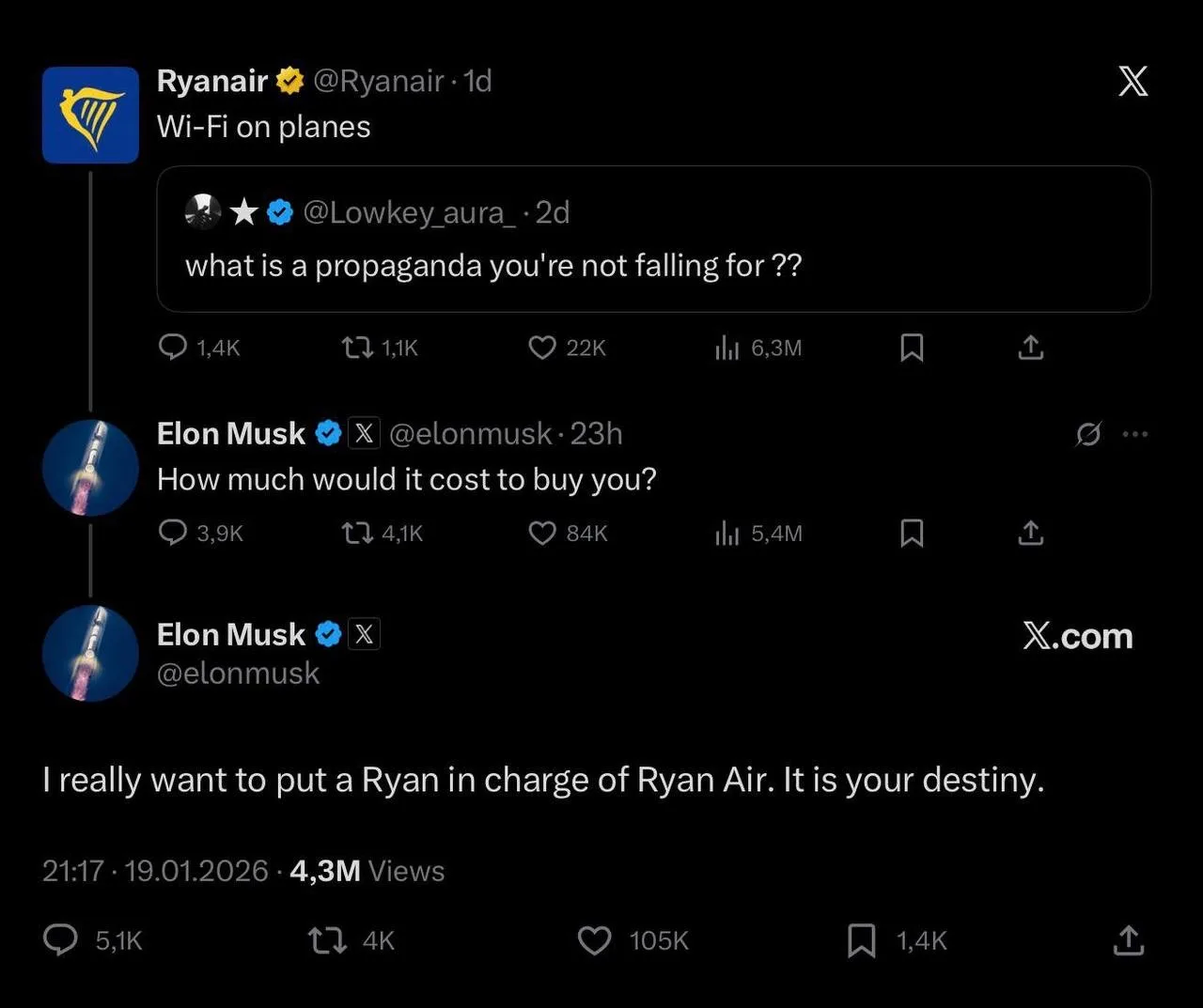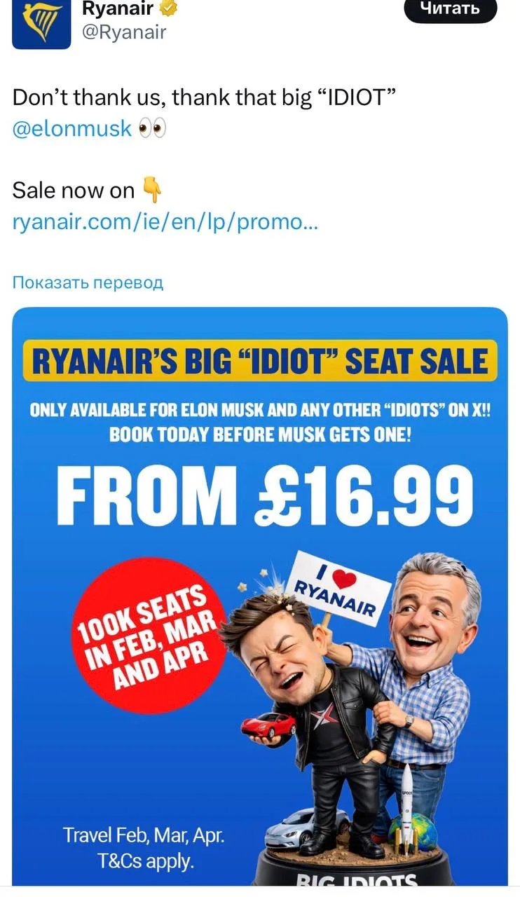 Причина — авиакомпания отказалась ставить Starlink на свои самолёты. Публичная перепалка в Х быстро съехала с обсуждения интернета в воздухе на личные выпады, и в какой-то момент Маск написал, что проще, мол, взять и купить Ryanair, уволить несговорчивого босса и сделать «как надо».