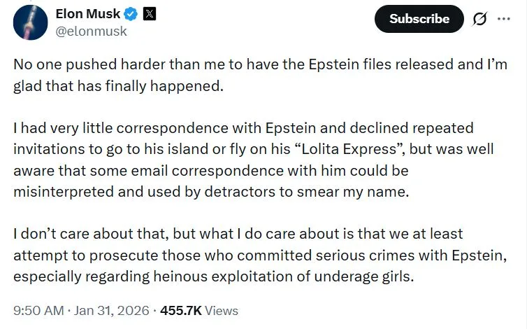 Никто не давил на выпуск файлов Эпштейна сильнее меня, и я рад, что это, наконец, произошло. У меня было очень мало переписки с Эпштейном, и я неоднократно отказывался от приглашений на его остров или полётов на его «Лолитa Экспресс», но я прекрасно понимал, что часть переписки с ним может быть неправильно истолкована и использована недоброжелателями для очернения моего имени.