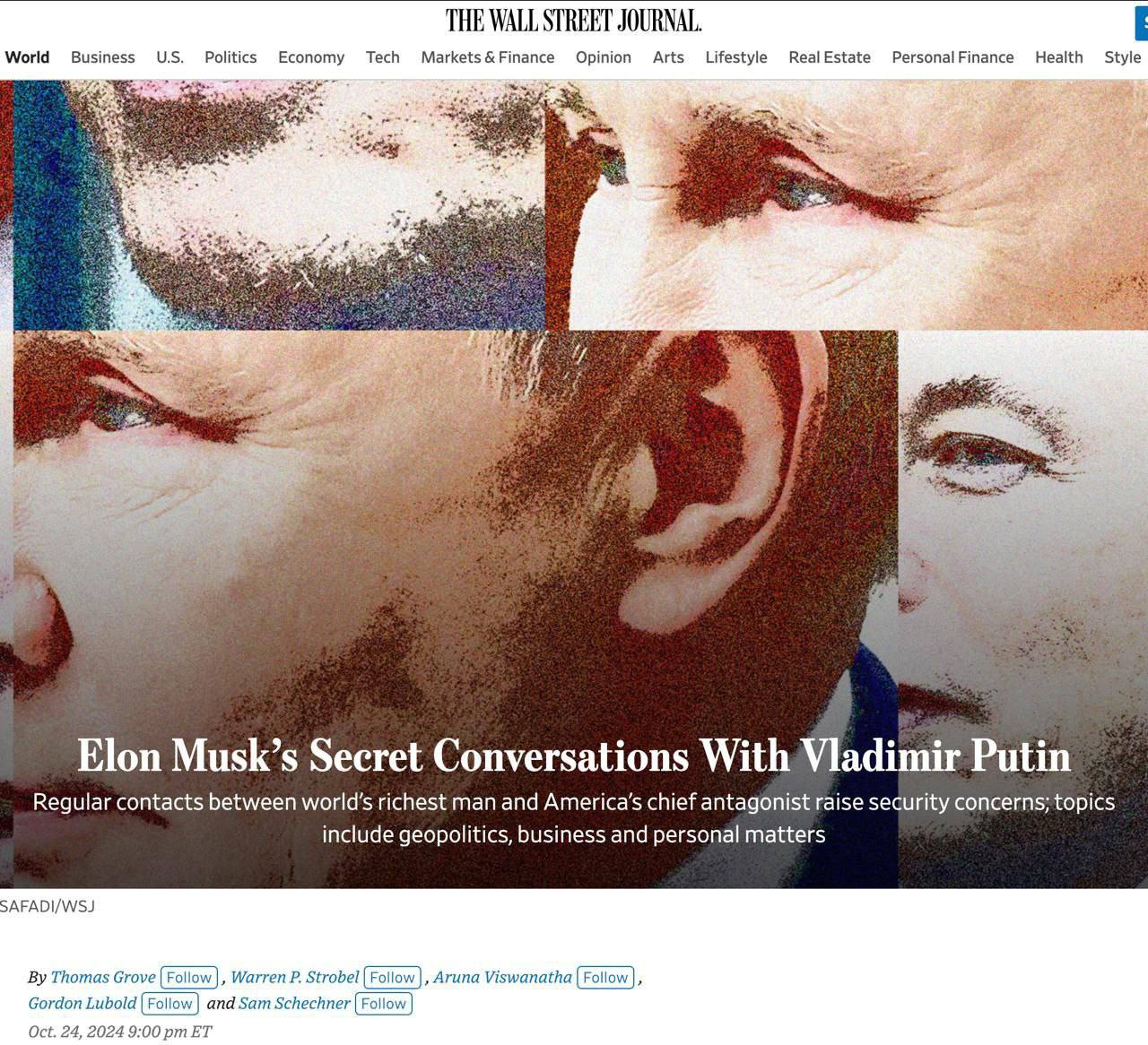Сообщают, что осенью 2022 года политолог Ян Бреммер заявил, что Маск рассказал ему о своем разговоре с Путиным и о «красных линиях» Кремля. Также как пример приводят, что в конце 2023 года Кремль попросил Маска не включать Starlink над Тайванем – в качестве «одолжения» Си Цзиньпину.