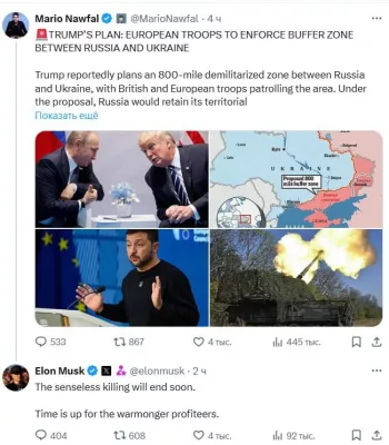 — Так Маск прокомментировал пост о якобы намерении Трампа создать 800-мильную демилитаризованную зону по линии фронта на Украине, где должны разместиться британские и европейские войска: