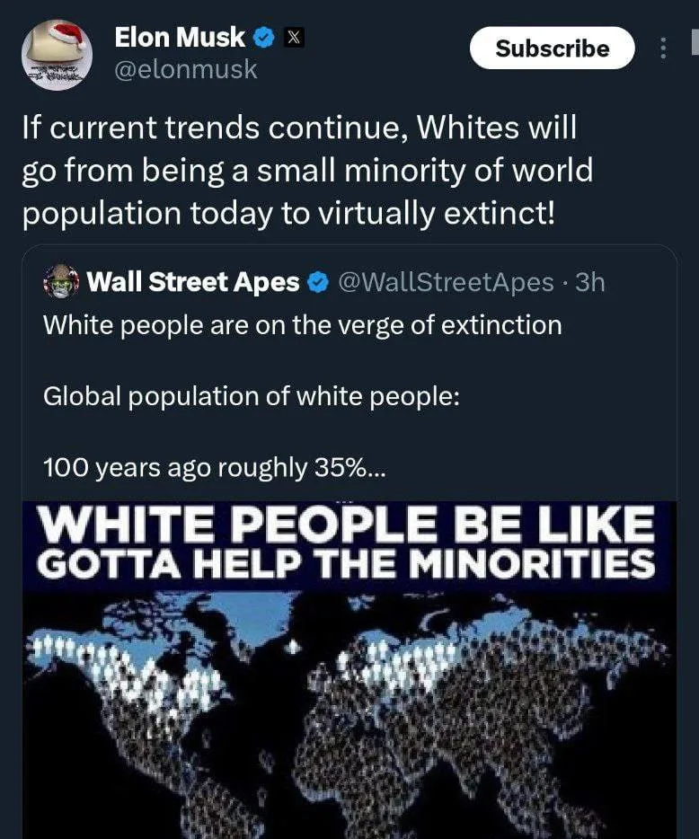 Маск и раньше высказывался на расистскую тему. Он также говорил, что не запустит Starlink в ЮАР из-за требования передавать 30% бизнеса чернокожим предпринимателям.