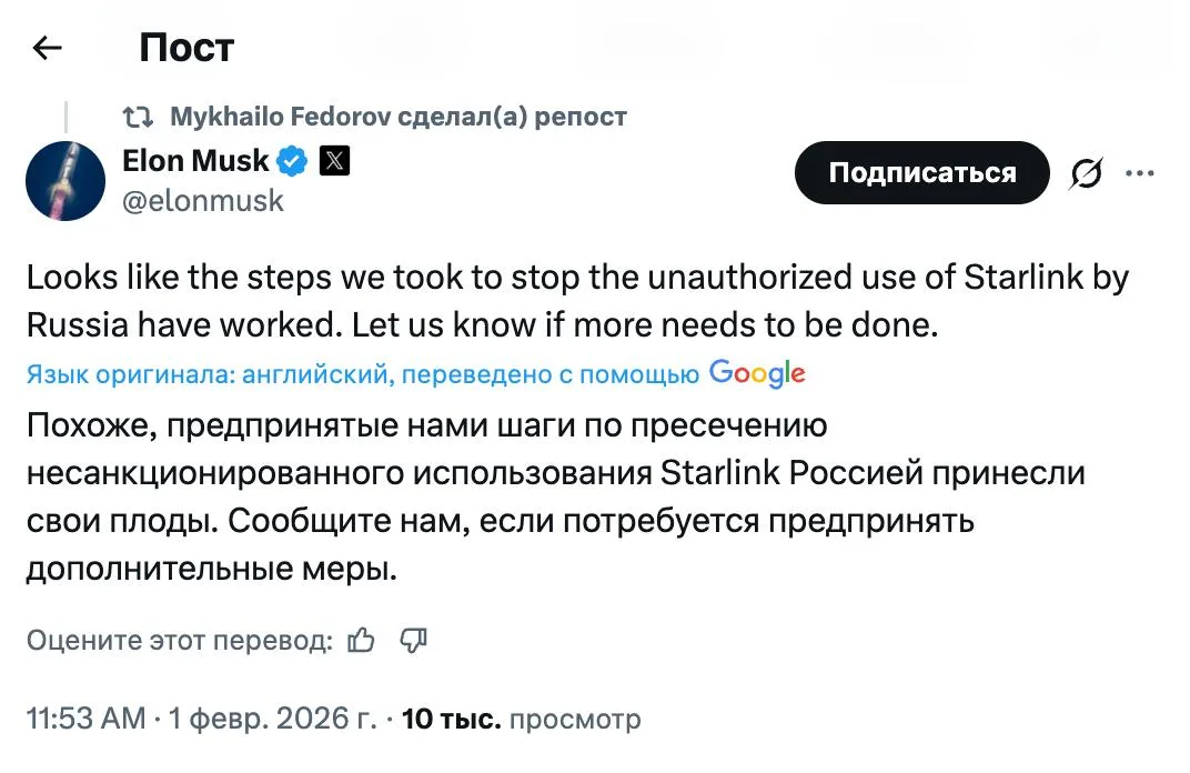 Главная страница » Новости и статьи Илон Маск заявил, что усилия по блокировке доступа к терминалам Starlink со стороны России «принесли плоды» Автор Модератор Опубликовано 01.02.2026Комментариев 0 Добавь сайт в закладки нажми CTRL+D What’s your Reaction? +1 0 +1 0 +1 11 +1 3 +1 9 +1 1 +1 0 What’s your Reaction? +1 0 +1 0 +1 11 +1 3 +1 9 +1 1 +1 0 Поделись видео: