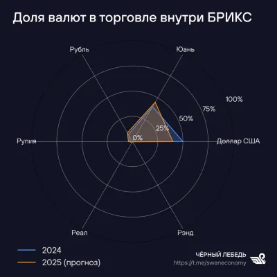 Но тут вопрос в том, что подумает Трамп. В 2024 году внутри БРИКС доля доллара в торговле, по оценкам, составила около 50%. С внешними странами — 90%. Прогноз на 2025 год: внутри БРИКС доля доллара может упасть до 40%. С внешними странами в торговле БРИКС доля доллара несколько уменьшается, но остаётся весомой — 85%.