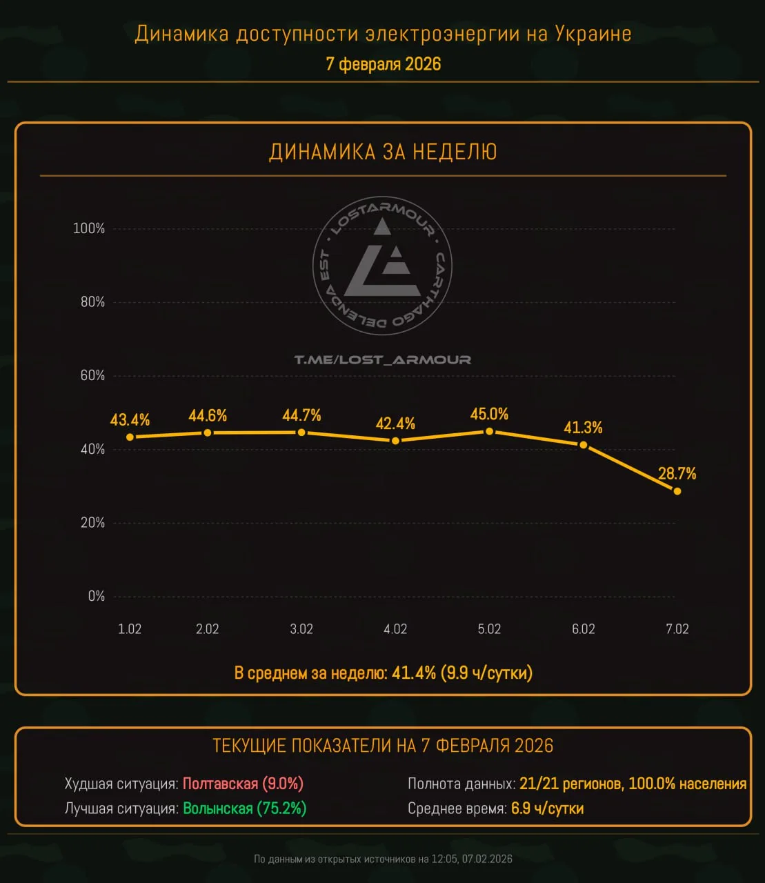• Среднее время доступности электроэнергии за сутки — 6,9 часов (28,7%) — самый низкий показатель с начала 2026 года!