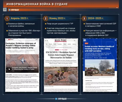 - Западные СМИ также играют свою роль. В ноябре 2023 года украинская газета Kyiv Post выпустила серию материалов с видео, подтверждающими присутствие украинского спецназа в Судане для борьбы с ЧВК «Вагнер», якобы поддерживающей СБР. Дополнительно эту историю поддержала газета Financial Times, которая в сентябре 2024 года сообщила, что отставные украинские лётчики якобы обучают силы армии Судана.