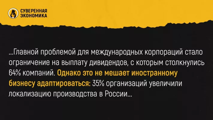 При этом 86% экспатов оценивают жизнь в России как комфортную, хоть треть и сталкивается с трудностями при проведении платежей. Главной проблемой для международных корпораций стало ограничение на выплату дивидендов, с которым столкнулись 64% компаний. Однако это не мешает иностранному бизнесу адаптироваться: 35% организаций увеличили локализацию производства в России до 90%, а треть полностью перешла на поставщиков из Китая, Индии и Турции.