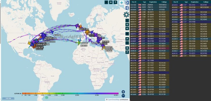 За последние 24 часа только транспортных самолетов ВВС США C-17A 49 единиц .Список не полный и не включает топливозаправщики или другие специализированные типы воздушных судов.