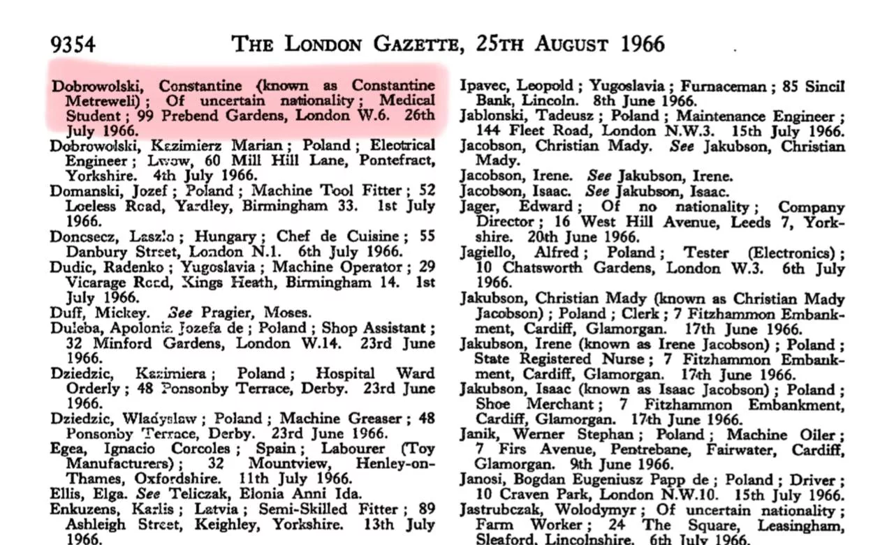 Вероятно, её отец — Константин Метревели, настоящая фамилия — Добровольский — получил британское гражданство, о чём свидетельствует запись о натурализации от 1966 года (на скриншоте). Там, кстати, отмечено, что он неопределнной национальности. До натурализации у него был так называемый Нансеновский паспорт, который он вполне мог получить за вывоз ценностей из СССР. Нансеновские паспорта выдавались беженцам без гражданства в 1922–1938 годах, в том числе русским эмигрантам.