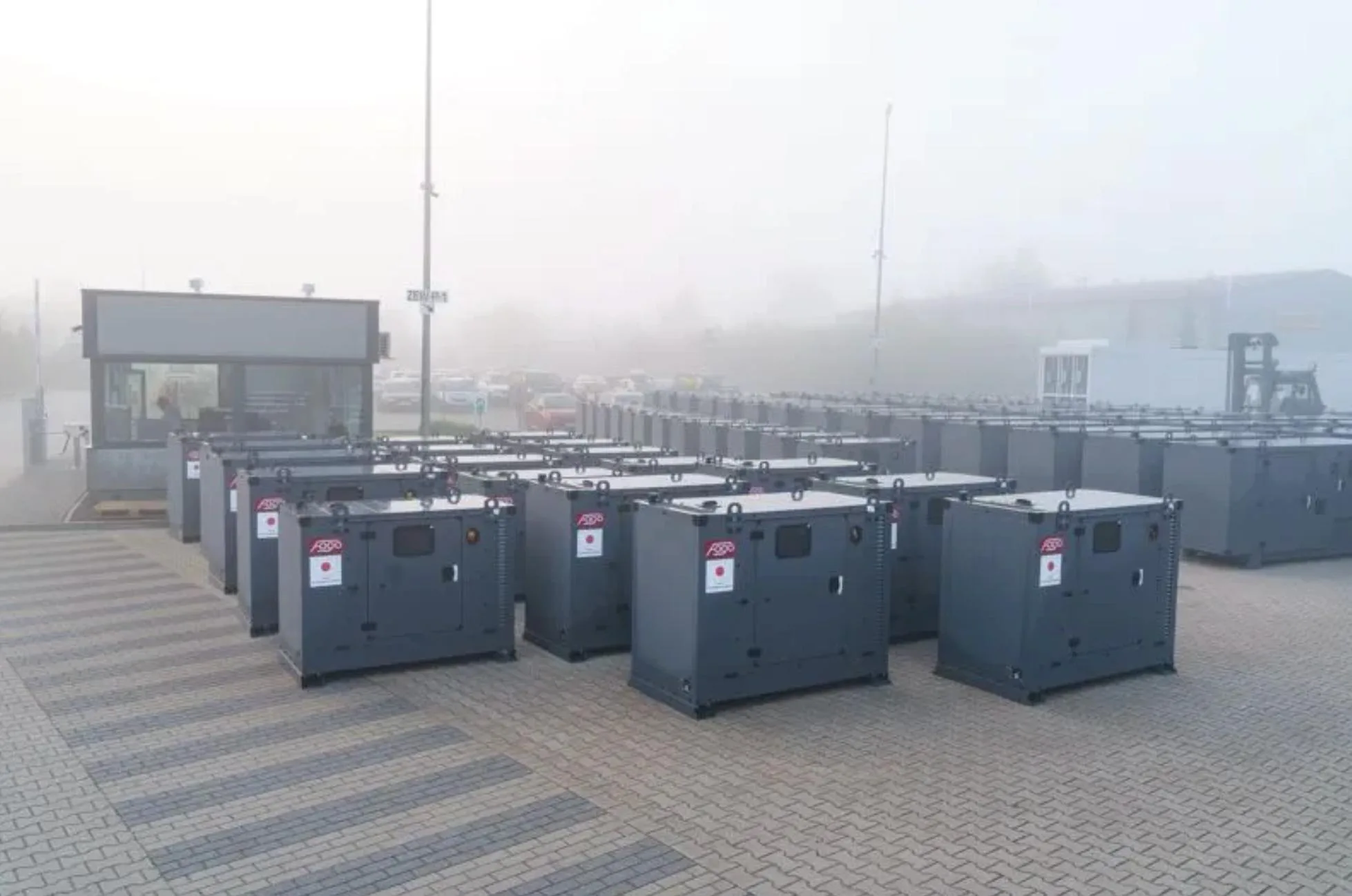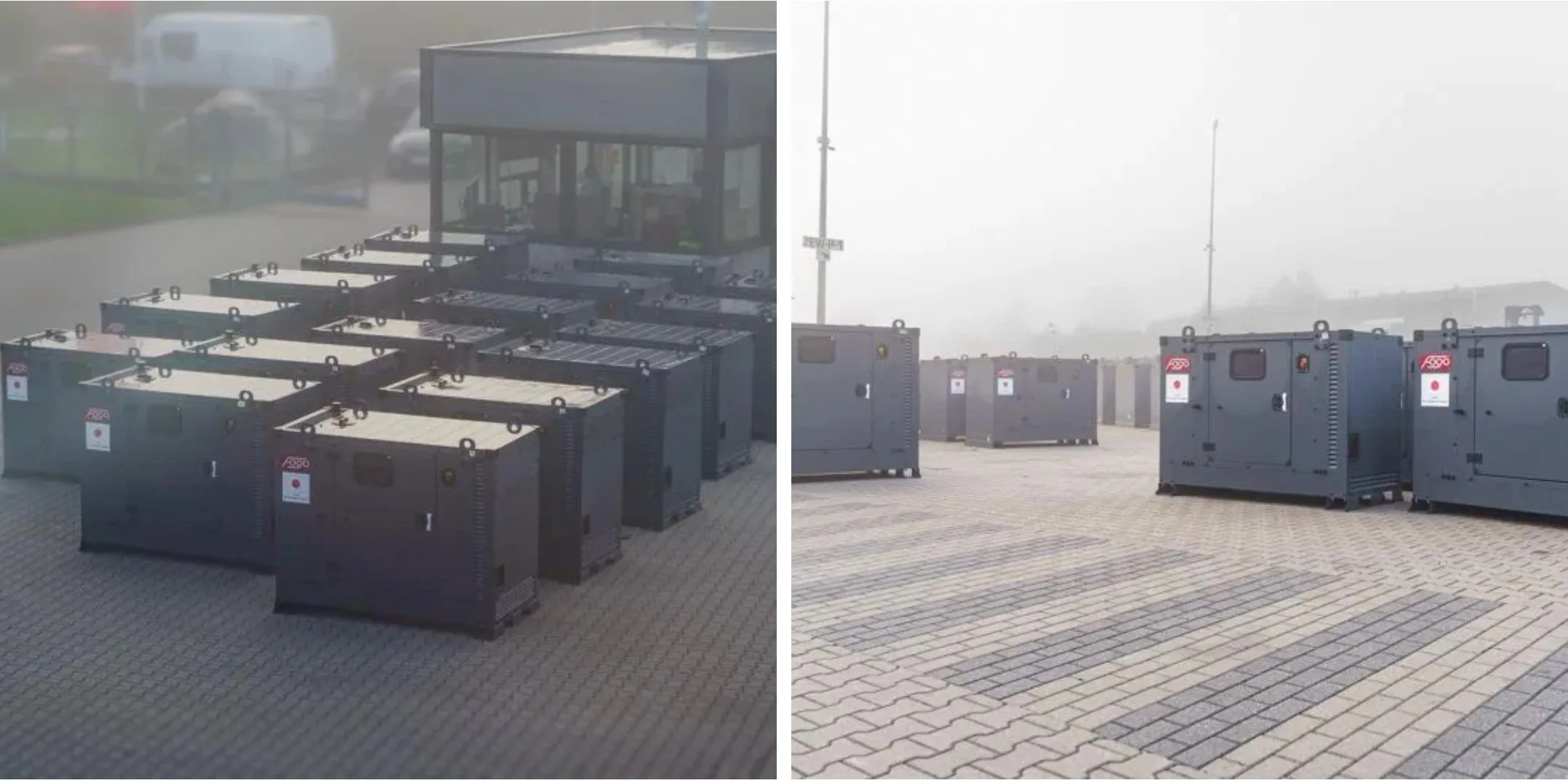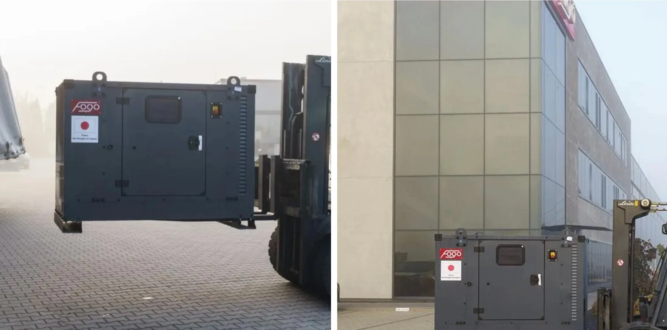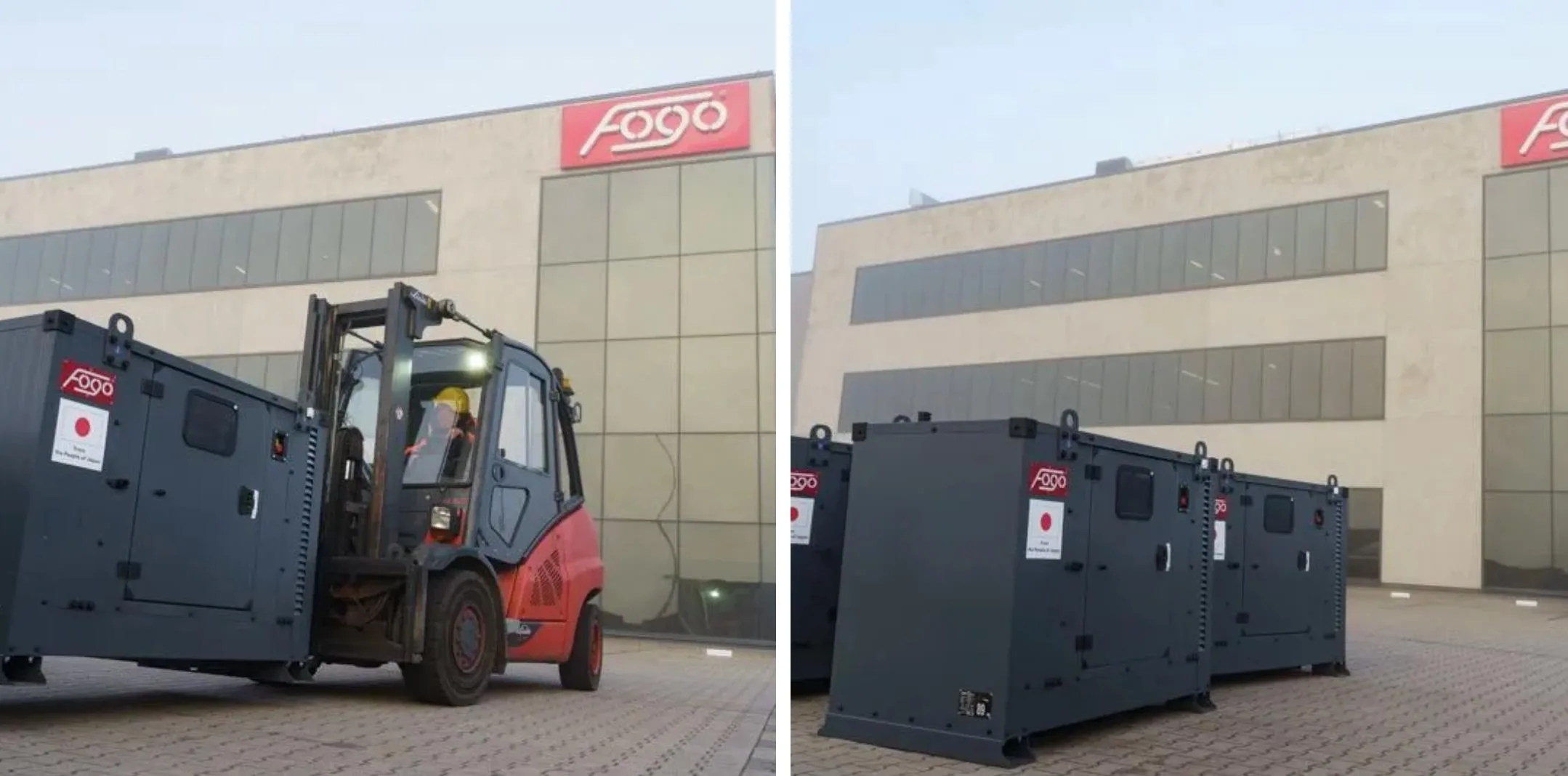 Это хорошо заметно по бренду производителя — компании Fogo. Судя по внешнему виду (характерный серый защитный кожух, расположение панелей и габариты), это генераторы из профессиональной серии FD (или FM).