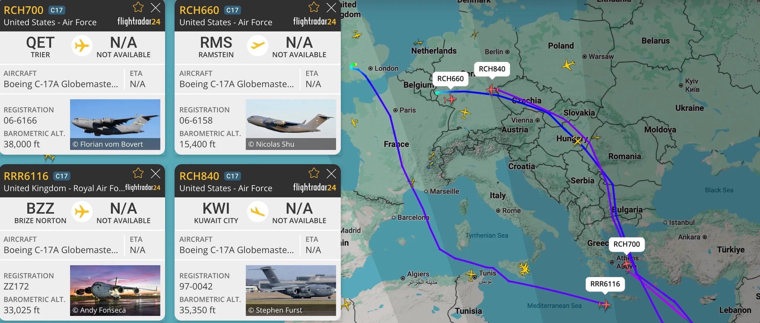 По крайней мере, именно там находится отправная точка для подавляющего большинства рейсов ВВС США. Интересно, что вклад союзников по НАТО в переброску вооружений и усиление группировки на Ближнем Востоке практически нулевой — сегодня в Катар прибыли редкие по меркам активности Альянса борты, например британский Boeing C-17A Globemaster и итальянский топливозаправщик Boeing KC-767A, которых у Италии всего четыре. Основная нагрузка по организации «воздушного моста» по-прежнему лежит на США.