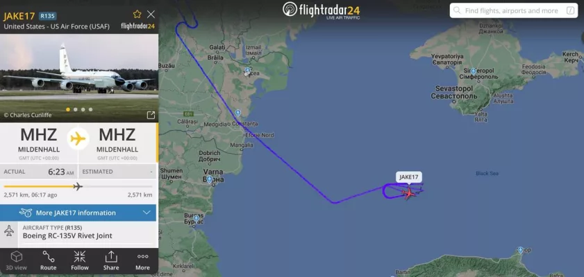 Вчера американский самолет РЭР RC-135V впервые на нашей памяти за время СВО провел патрулирование в центральной части Черного моря.