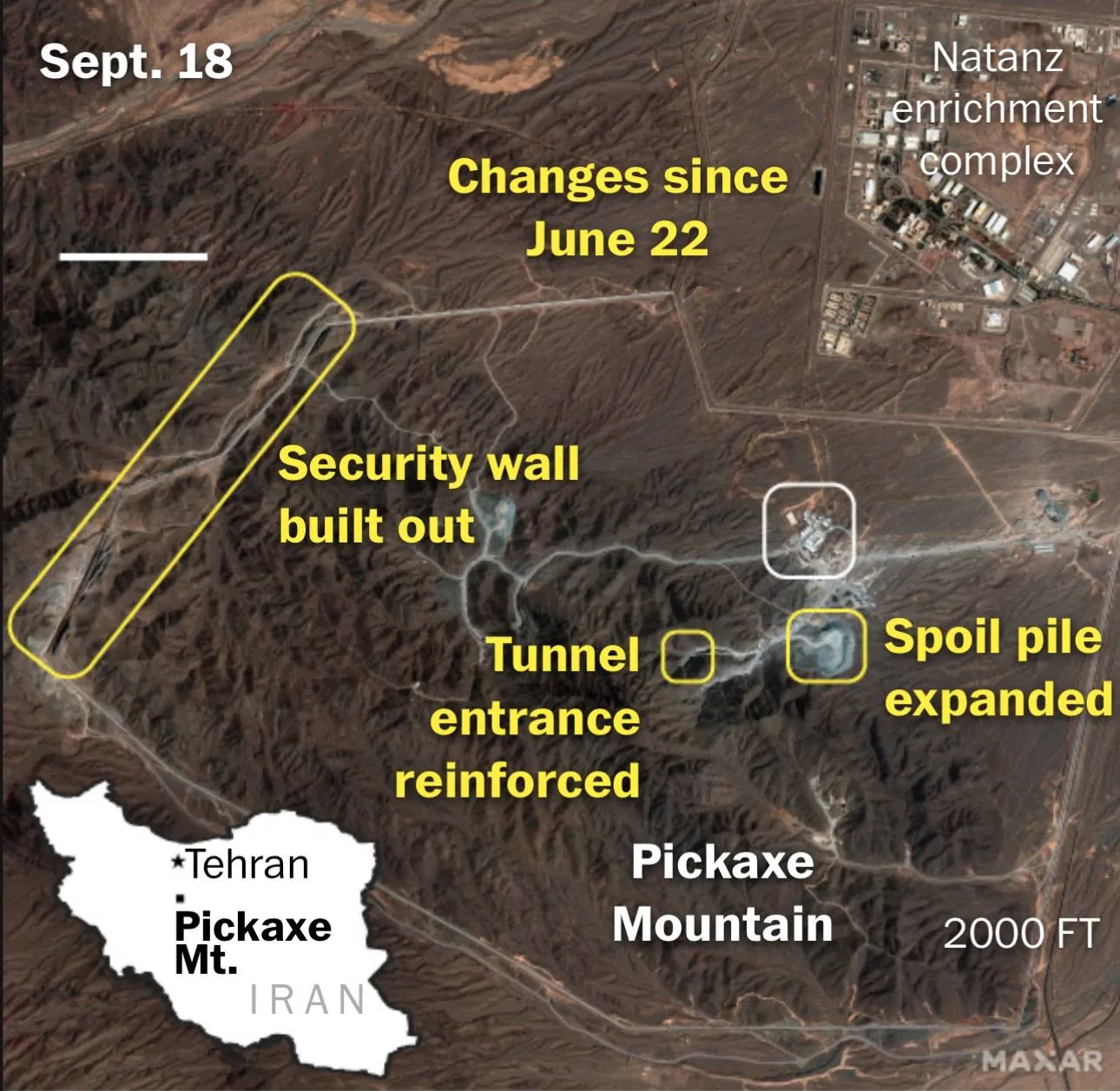 Работы ведутся на объекте, известном как Кух-э-Коланг Газ Ла или «Pickaxe Mountain», где с 2020 года иранские инженеры прокладывают туннели в горном массиве Загрос – в нескольких к югу от ядерного объекта в Нетензе, подвергшегося в июне израильским и американским ударам.
